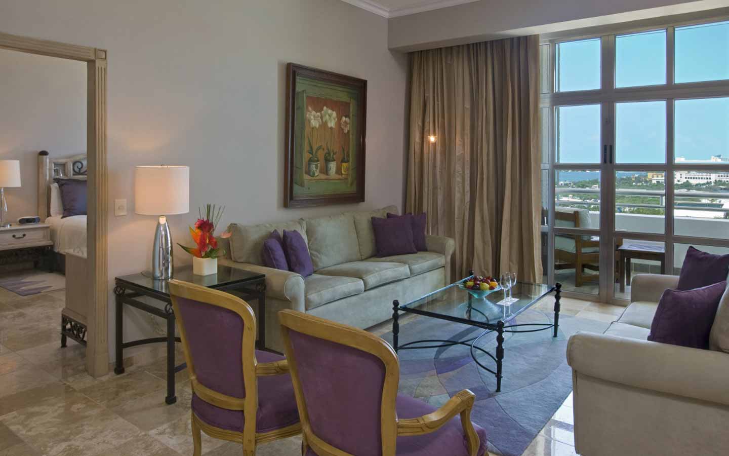 Two private balconies highlight the eye-catching views in spacious Laguna Suite at Sandos Cancun Resort. One balcony overlooking Nichupté Lagoon, and the other overlooking the Caribbean Sea. The Laguna Suite features a calming master bedroom with king bed, as well as a separate living and dining area with a well-equipped kitchenette.